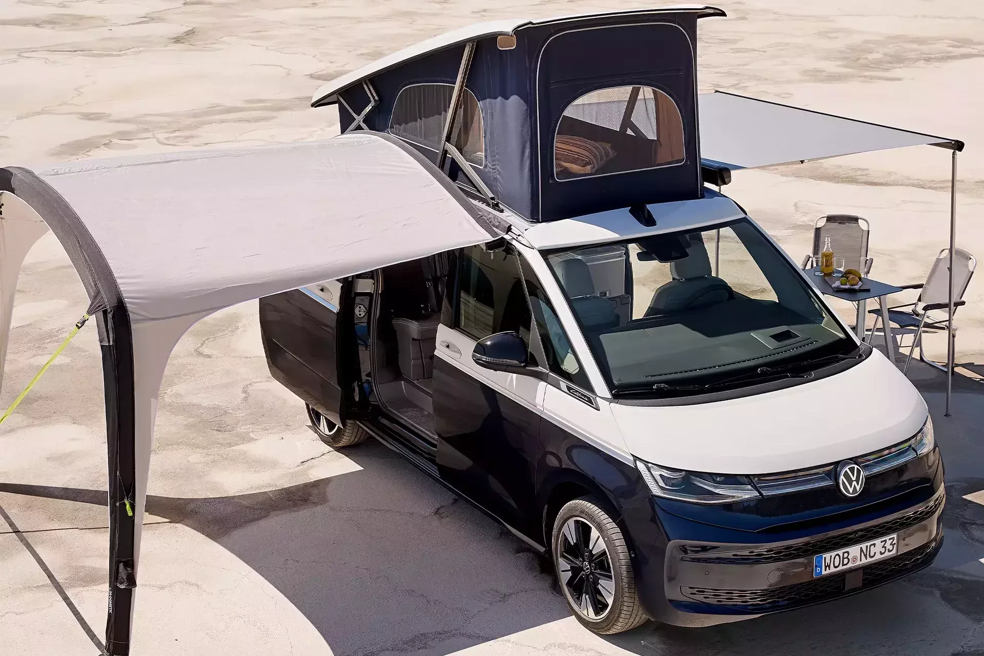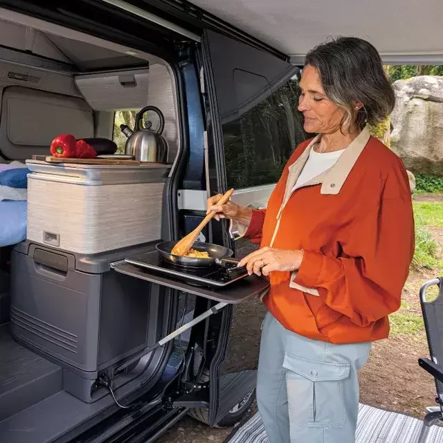 Der neue VW California verfügt serienmäßig über zwei Schiebetüren, die das Ein- und Aussteigen sowie das Be- und Entladen erleichtern – ideal für Alltag und Camping. Die linke Schiebetür ermöglicht zusammen mit der integrierten Sommerküche und dem ausklappbaren Tisch ein komfortables Kochen und Essen im Freien. Der Kühlschrank ist sowohl von außen als auch von innen zugänglich und kann dank einer optionalen Markise vor Sonne und Regen geschützt werden. So schaffst du dir im Handumdrehen zusätzlichen Raum – fast wie eine „3-Raum-Wohnung“ auf Rädern.