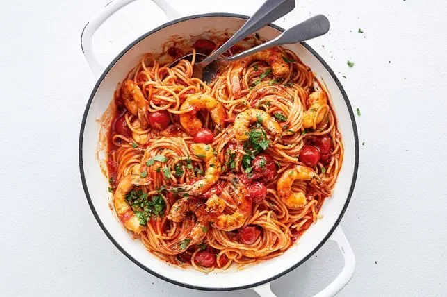 Add the cleaned prawns to the pasta and toss with tongs until everything is well combined. Cover and cook for 3 minutes until the prawns change colour. Drizzle with oil and sprinkle with parsley. To serve, season with a little pepper and your prawn pasta is ready.